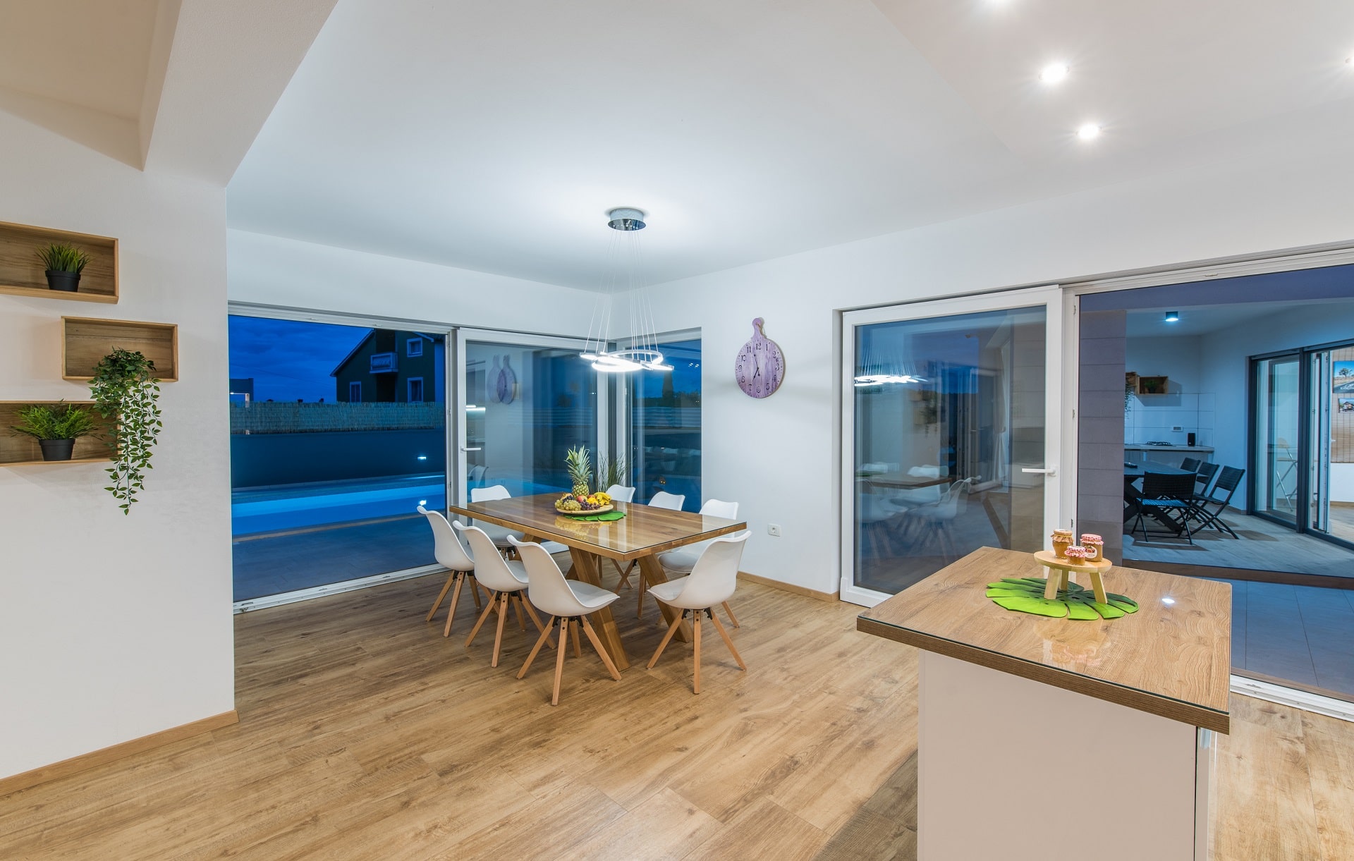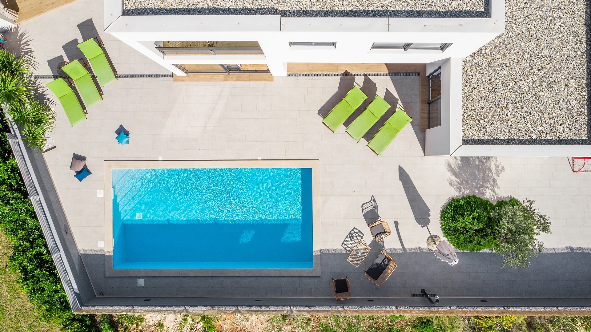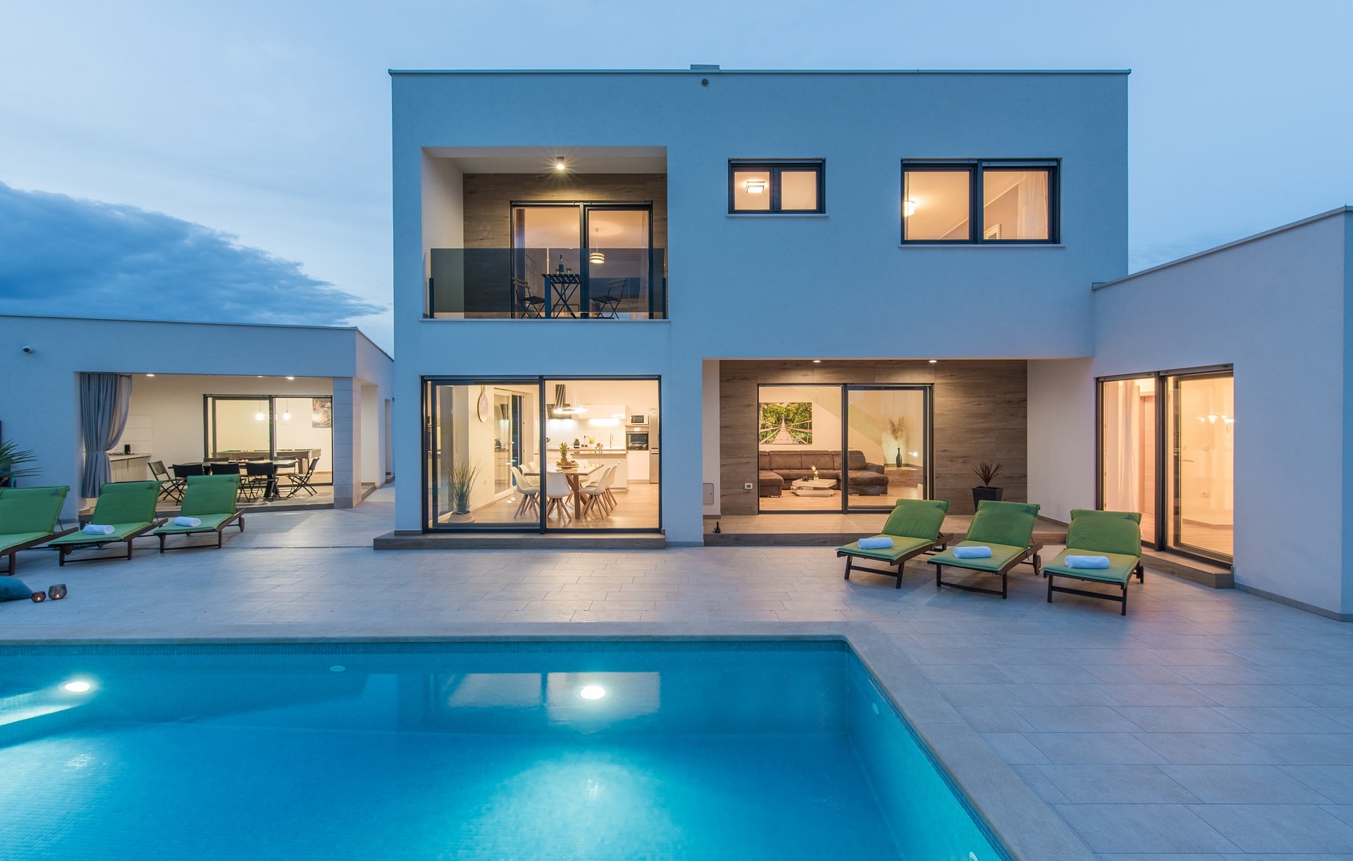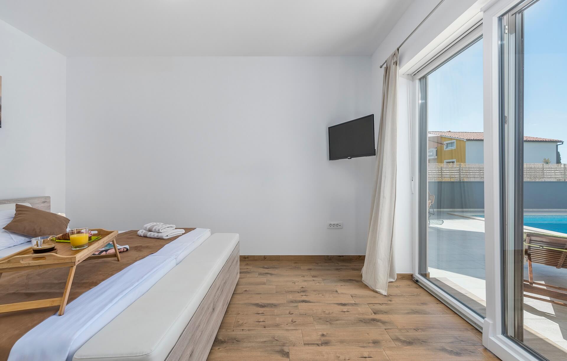 Die Villa OL&JU bietet Platz bis zu 7+2 Gästen. In ihren 3 luxuriösen Schlafzimmern, die alle klimatisiert sind und über einen eigenen Fernseher verfügen. Im ersten Stock befinden sich ein grosses Badezimmer und zwei komfortable Schlafzimmer (Zwei- und Dreibettzimmer). Im Erdgeschoss der Villa befindet sich eine voll ausgestattete offene Küche, ein grossflächiges Wohnzimmer, ein Schlafzimmer mit eigenem Badezimmer und eine Gästetoilette. Vom Wohnzimmer aus betreten Sie eine geräumige Terrasse mit Blick auf den grossen Pool.