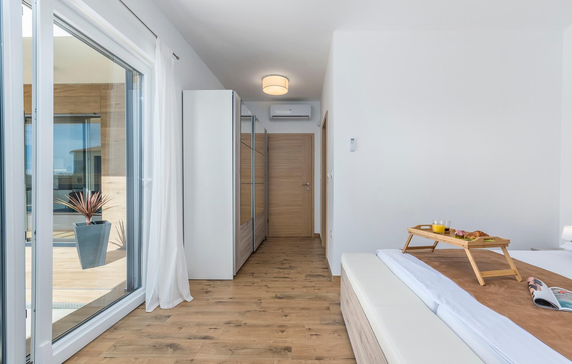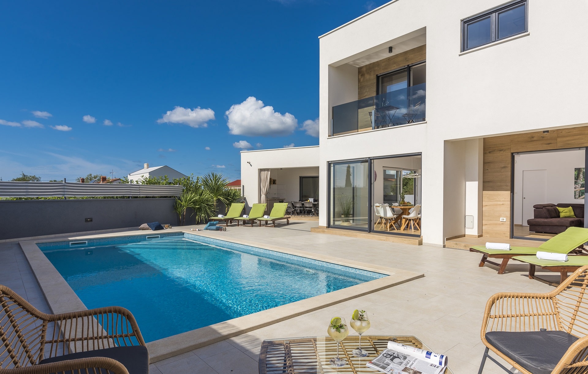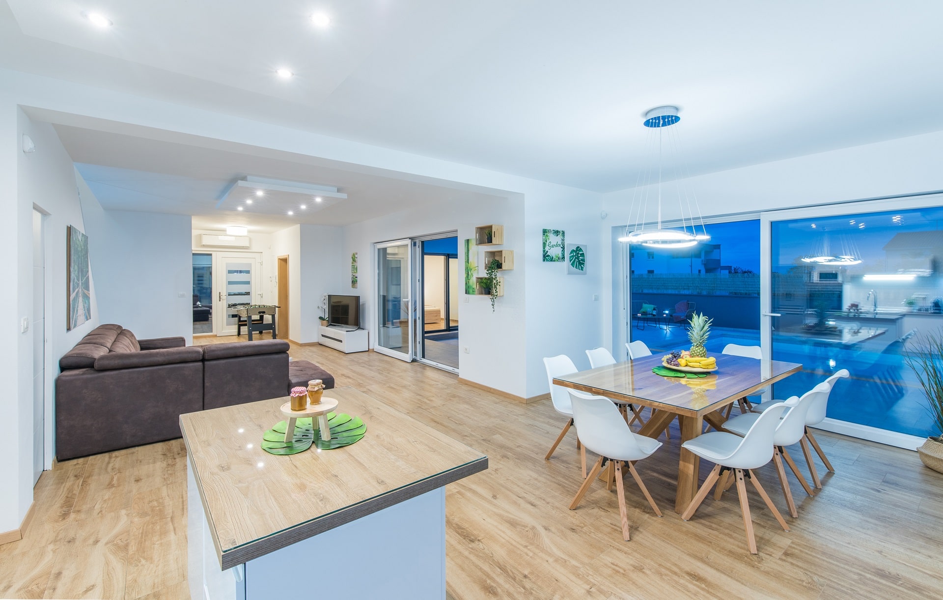 Die Villa OL&JU bietet Platz bis zu 7+2 Gästen. In ihren 3 luxuriösen Schlafzimmern, die alle klimatisiert sind und über einen eigenen Fernseher verfügen. Im ersten Stock befinden sich ein grosses Badezimmer und zwei komfortable Schlafzimmer (Zwei- und Dreibettzimmer). Im Erdgeschoss der Villa befindet sich eine voll ausgestattete offene Küche, ein grossflächiges Wohnzimmer, ein Schlafzimmer mit eigenem Badezimmer und eine Gästetoilette. Vom Wohnzimmer aus betreten Sie eine geräumige Terrasse mit Blick auf den grossen Pool.
