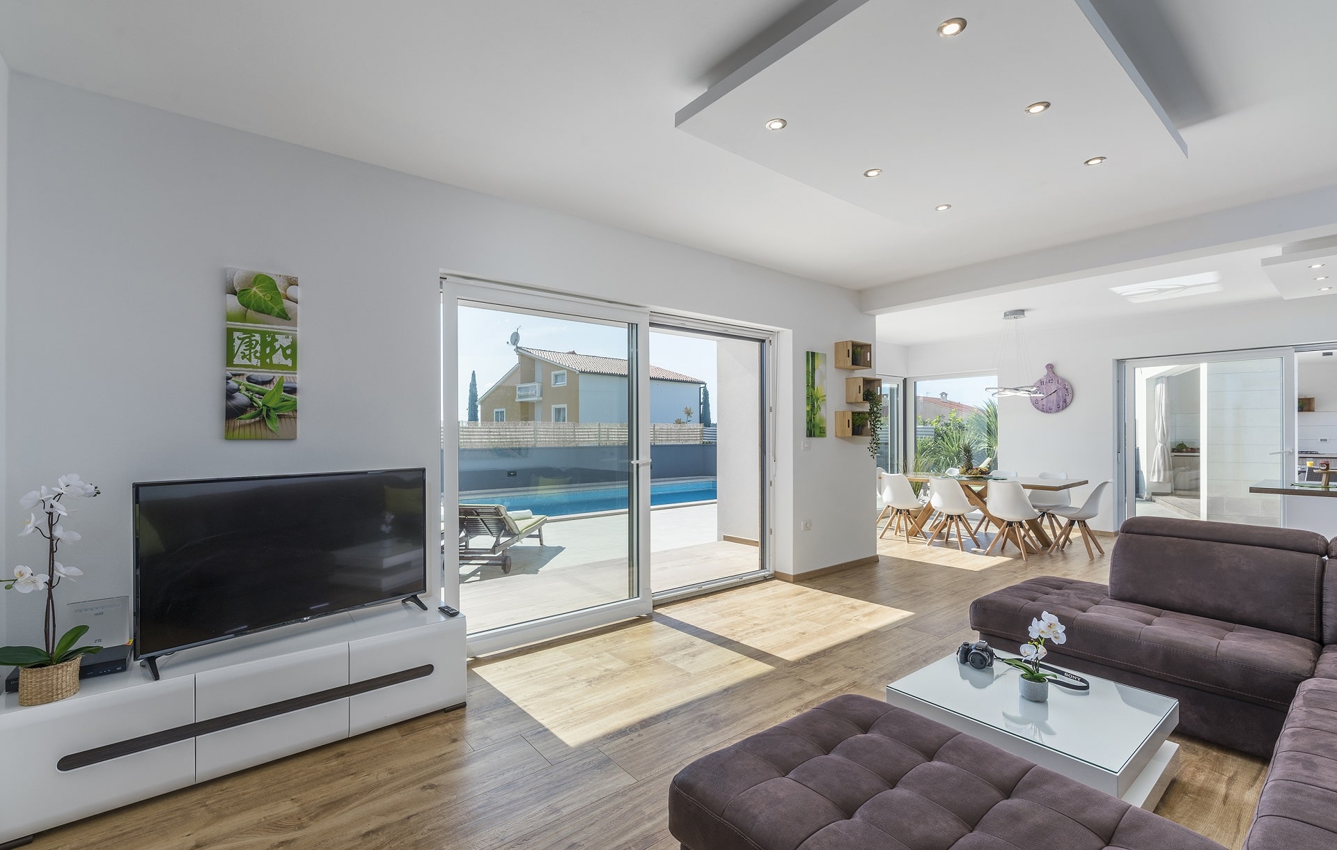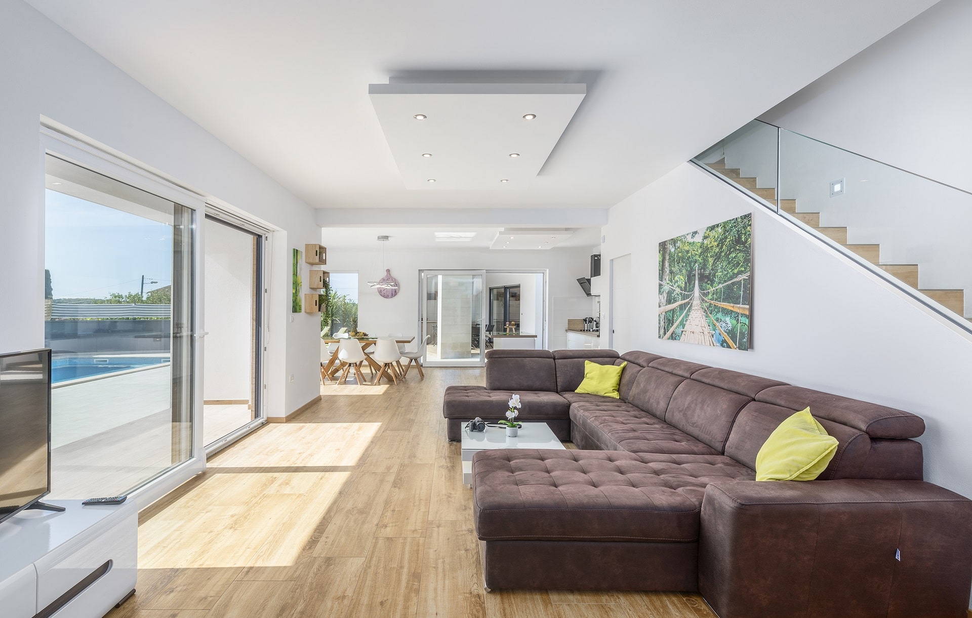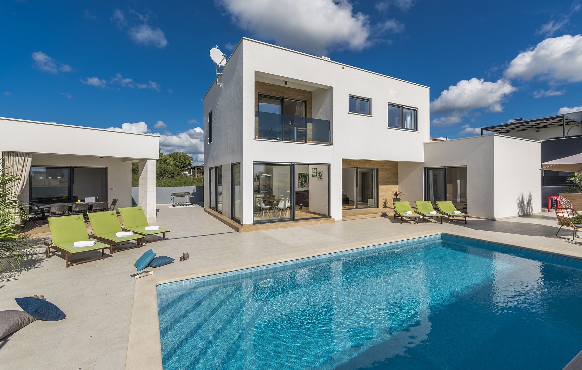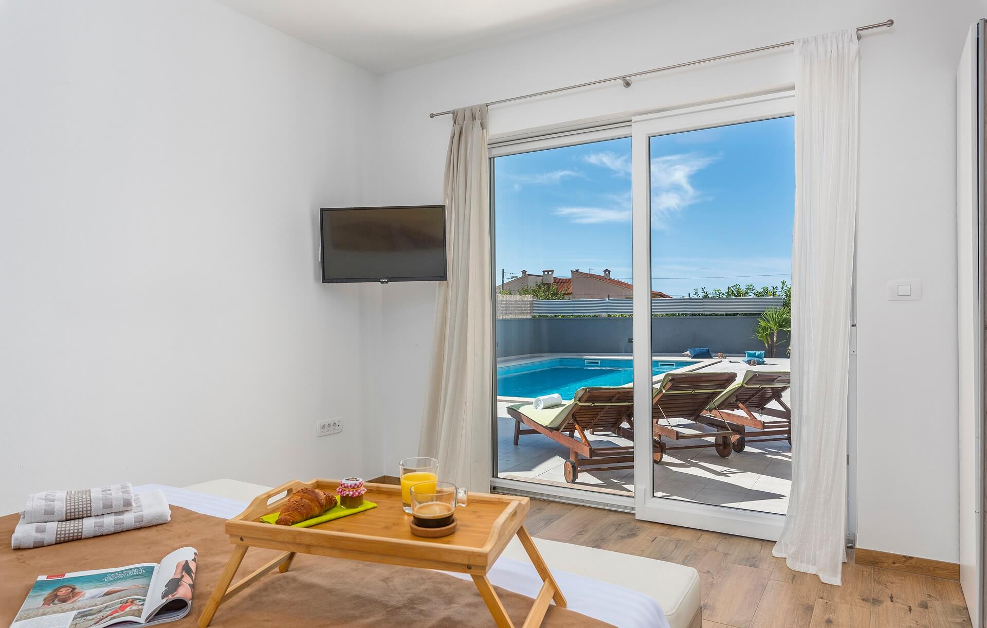 Die Villa OL&JU bietet Platz bis zu 7+2 Gästen. In ihren 3 luxuriösen Schlafzimmern, die alle klimatisiert sind und über einen eigenen Fernseher verfügen. Im ersten Stock befinden sich ein grosses Badezimmer und zwei komfortable Schlafzimmer (Zwei- und Dreibettzimmer). Im Erdgeschoss der Villa befindet sich eine voll ausgestattete offene Küche, ein grossflächiges Wohnzimmer, ein Schlafzimmer mit eigenem Badezimmer und eine Gästetoilette. Vom Wohnzimmer aus betreten Sie eine geräumige Terrasse mit Blick auf den grossen Pool.