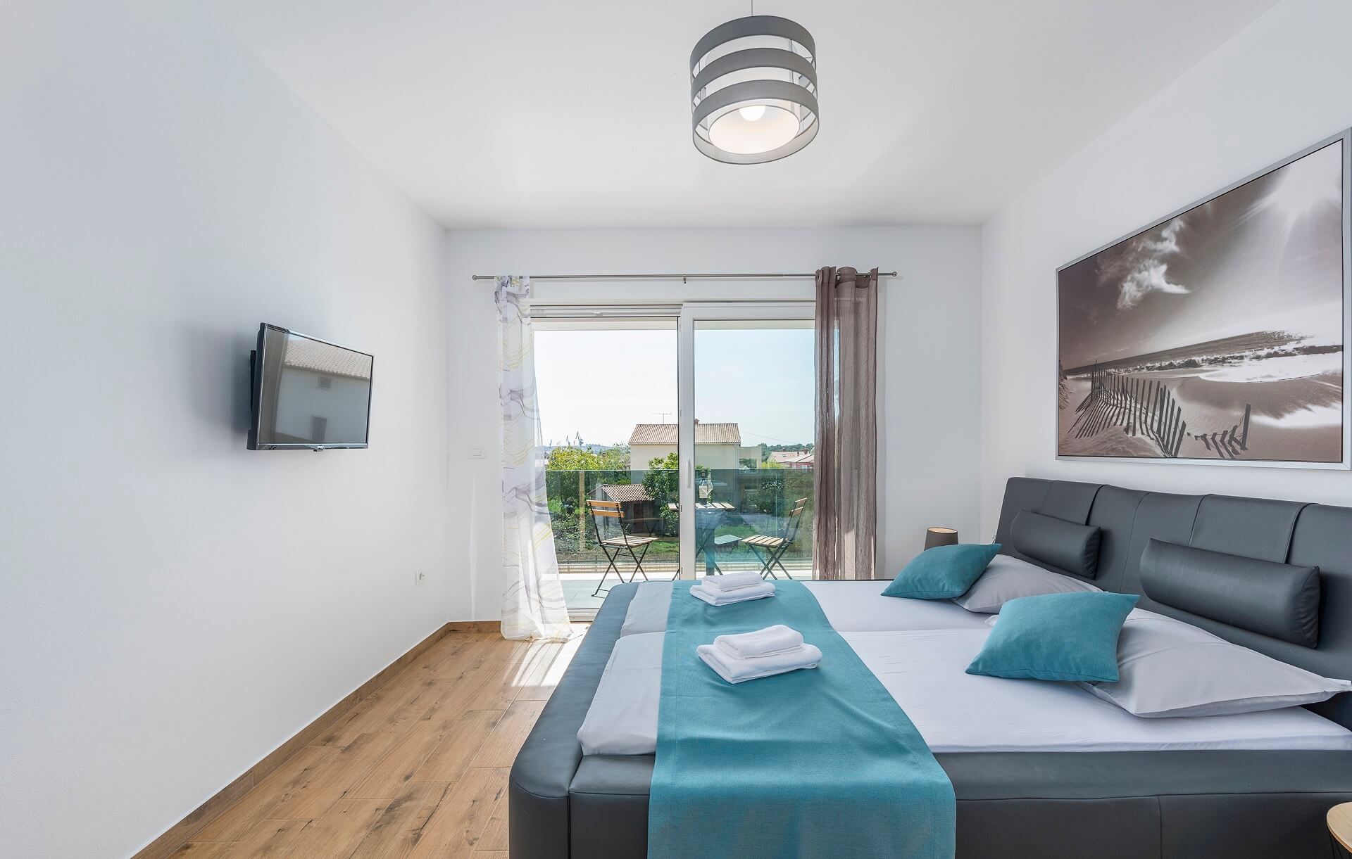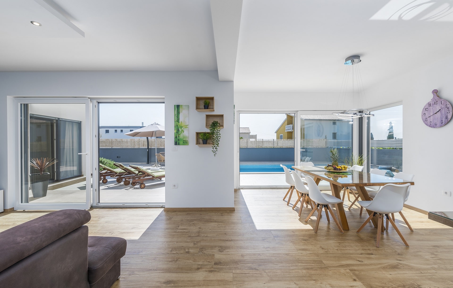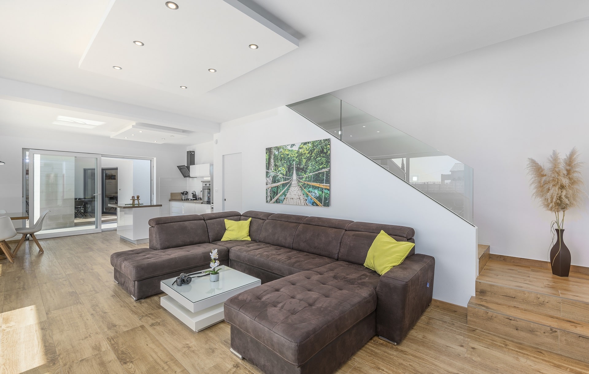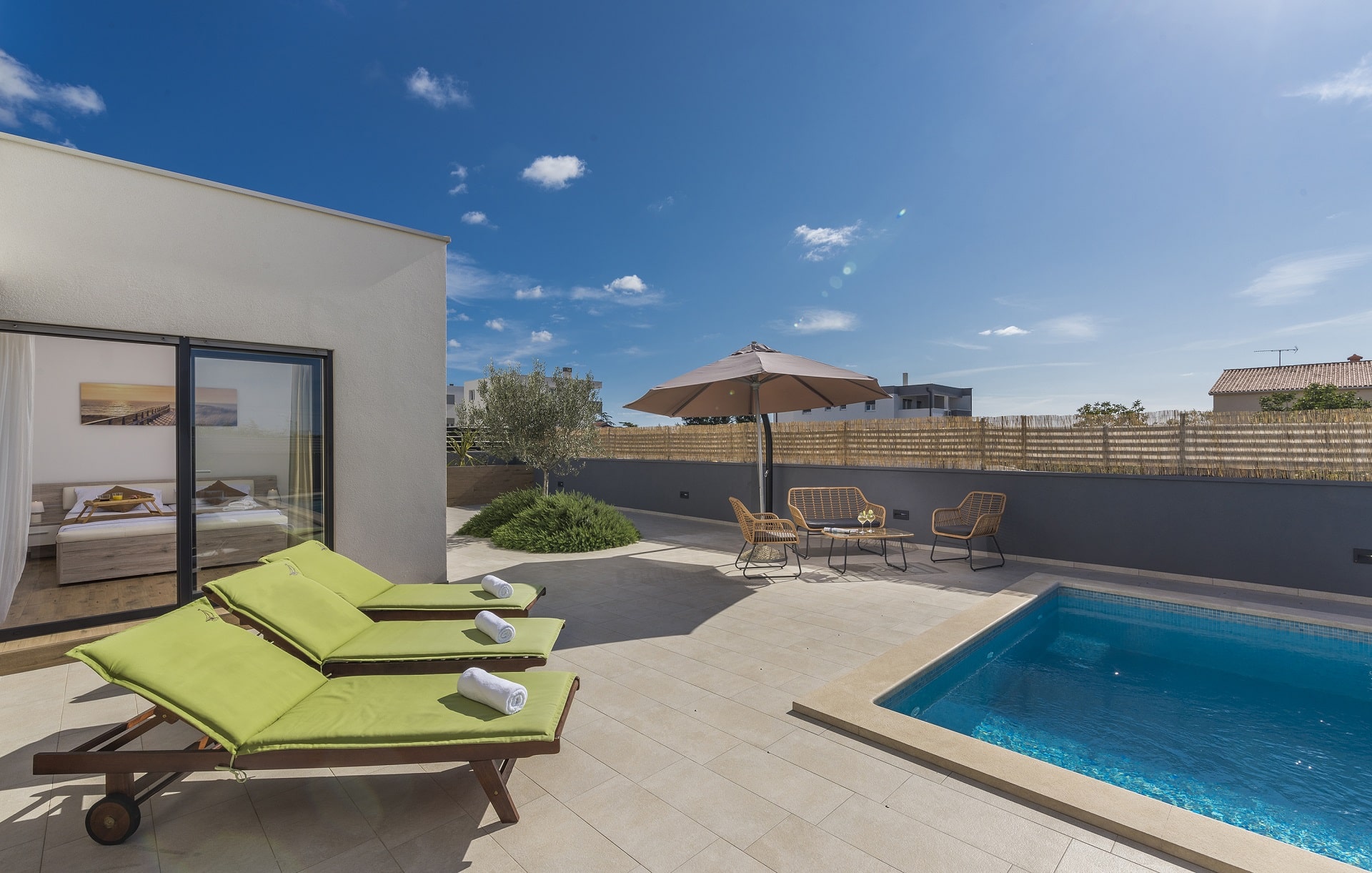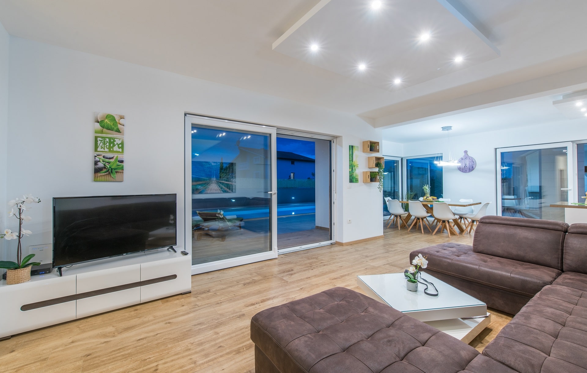 Die Villa OL&JU bietet Platz bis zu 7+2 Gästen. In ihren 3 luxuriösen Schlafzimmern, die alle klimatisiert sind und über einen eigenen Fernseher verfügen. Im ersten Stock befinden sich ein grosses Badezimmer und zwei komfortable Schlafzimmer (Zwei- und Dreibettzimmer). Im Erdgeschoss der Villa befindet sich eine voll ausgestattete offene Küche, ein grossflächiges Wohnzimmer, ein Schlafzimmer mit eigenem Badezimmer und eine Gästetoilette. Vom Wohnzimmer aus betreten Sie eine geräumige Terrasse mit Blick auf den grossen Pool.